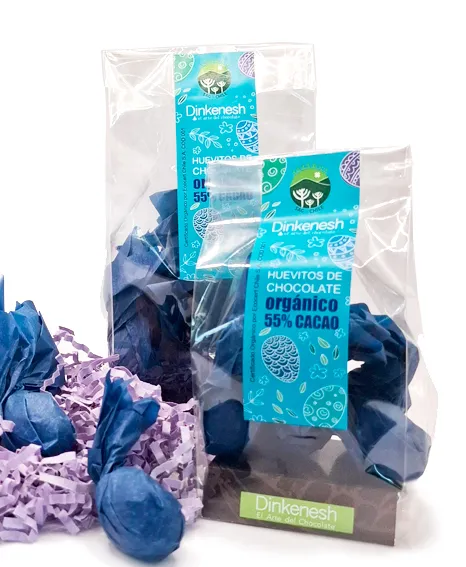 Deliciosos huevitos macizos de chocolate organico y vegano, 55% de cacao, libre de leche, soya, gluten, frutos secos, huevo, pescado y crustáceos. Unidades 9 - Peso aprox: 100 grs Ingredientes: Pasta de cacao organica, manteca de cacao organica, azúcar organica de caña sin refinar, cacao organico. Certificado organico por Ecocert Chile Envase Biocompostable