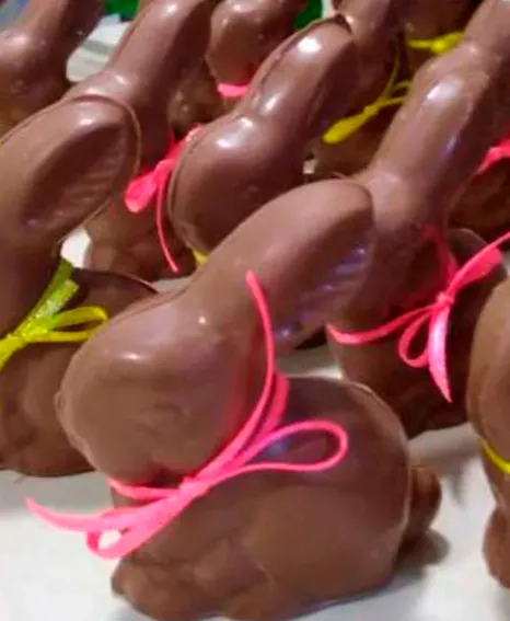 Hermosa, coqueta y deliciosa conejita con mochila, lista para una excursion o salir de picnic. Elaborada en chocolate de leche 36% de cacao, peso aprox 150 grs.